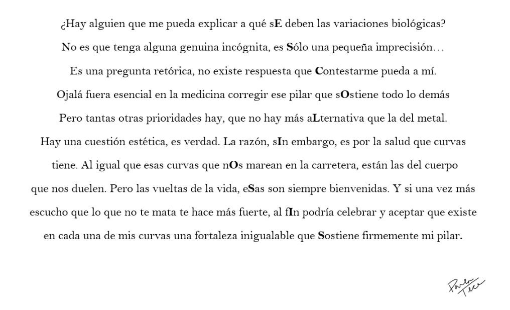 Con motivo de que junio es el mes de lucha contra la escoliosis, he decidido dejar este escrito por aquí. Personalmente, porque un 31 de mayo hace más de diez años, fui sometida a una operación de columna, así que conmemoro con estos versos asimétricos que llevo ya más de la mitad de mi vida lidiando con escoliosis. Y en un ámbito más general, porque todos aquellos que conocen lo difícil que es lidiar con escoliosis, de alguna manera u otra (espero), podrán reconocerse en estos versos. Así que se los dedico a quienes saquen fortaleza de sus curvas.