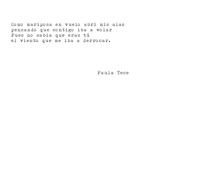 mariposa. Paula TeceJuly 29, 2020Letras Post navigation PreviousNext Paula Tece 29/7/2020 Share this: Share on X (Opens in new window) X Share on Facebook (Opens in new window) Facebook Share on WhatsApp (Opens in new window) WhatsApp Email a link to a friend (Opens in new window) Email Like Loading...