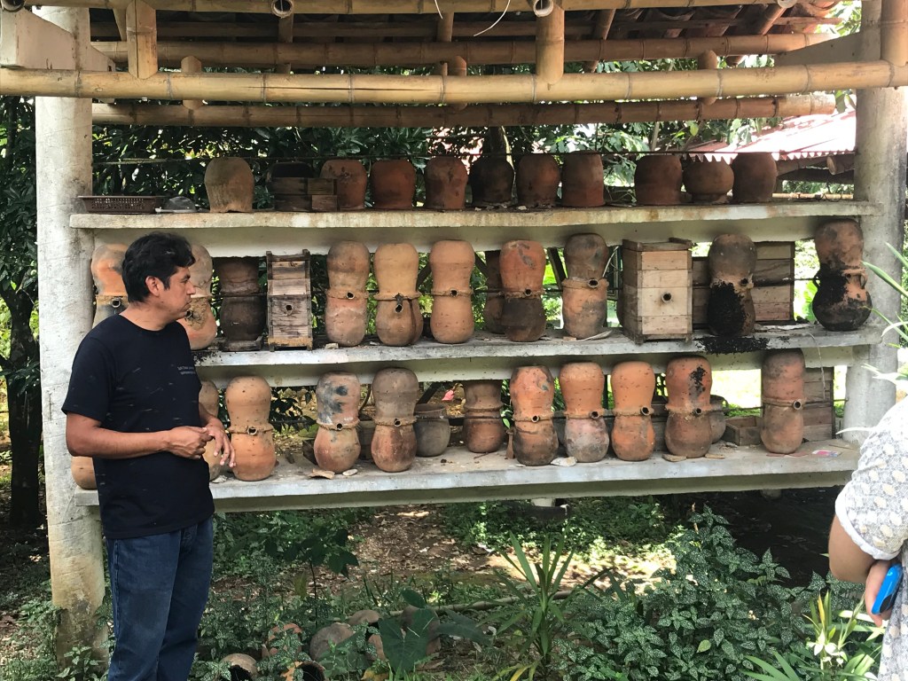 Octavio, nuestro guía y amigo, se encuentra en la foto. Ese día, nos estaba contando sobre la abeja Pisil Nekmej. Nos dijo que estas pequeñas abejas negras son de origen mexicano y no tienen aguijón. Ninguno de nosotros sabía de la existencia de estas abejas. También nos contó que es una tradición y herencia de la cultura náhuatl la cosecha de miel de estas abejas. Aparte de tener un sabor exquisito con propiedades completamente naturales, esta miel tiene propiedades medicinales. Esta cosecha también forma parte de la cooperativa que lleva el hotel donde nos quedamos – un lugar realmente mágico y lleno de sorpresas.