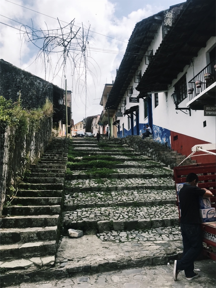 Pensé en el Realismo Mágico. ¿Así se podría representarlo? Calles empedradas que la naturaleza interrumpe para agregar verde al suelo donde pisamos. No importa qué condición física tengas, no importa si hay escalones, subidas, bajadas, o una calle normal – simplemente no te cansas de caminar; no terminas de caminar. Un cielo azul que te oculta la hora del día, que te hace ganar el tiempo (en vez de perderlo). Las calles coloridas podían tomar rumbos diferentes para llevarte a lugares únicos. Esas manchas blancas eran huellas del tiempo, un recordatorio de que nada en esta vida permanece intacto; el toque de realidad en el pueblo tan mágico.