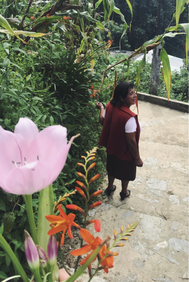 Ella es Aurelia, una de las mujeres con quien trabajamos. Una mujer llena de alegría, siempre con un chiste o una historia para contarnos. Ese día nos habían invitado a comer, y mientras caminábamos de una casa a otra, nos encontramos con este bloque de flores. Arrancó sus favoritas y me las dio; “estas flores crecen siempre. Las flores me ponen contenta, y te pondrán contenta a ti también.” Cortó más, contando a cuántas personas más le regalaría flores ese día. Me imaginé que esa sería su rutina; caminar, cortar flores, ser feliz, trabajar, disfrutar a la familia. Ah, eso y hacer una bebida que ella le llama “Chingadazo” porque cuando te lo sirve en un pequeño vaso, te lo tienes que tomar así – de chingadazo. Lo preparaba con cualquier fruta que tuviera cerca y nos dijo que la vida era mejor con chingadazos. No supe si se refería a la bebida o a los chingadazos de la vida. Pero pensé que era bonita su forma de ser feliz, ¿no? Con flores y chingadazos.