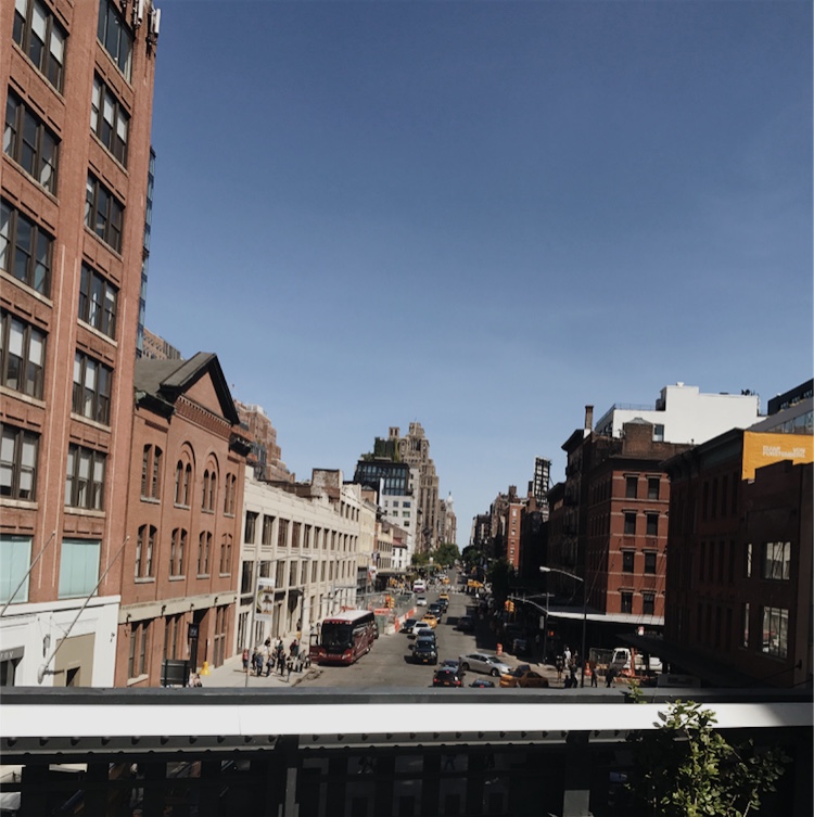 Aquí el Chelsea Market se esconde bajo un cielo azul. Estaba parada en el puente mientras Nueva York me llenaba los oídos de bocinas de coches, mientras me llegaba a la nariz el olor de la comida urbana, y mientras se me llenaba la cabeza de pensamientos.